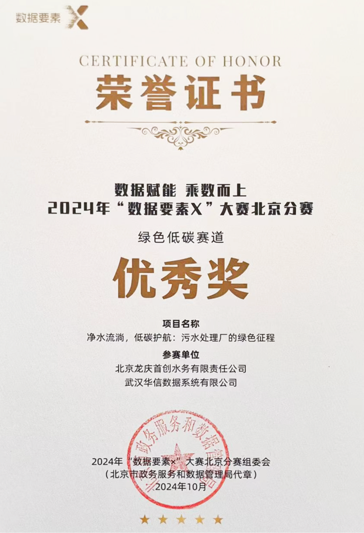大赛北京分赛区是全国20个赛区中最重要的赛区,奖项评审由6位院士领衔的专家团队完成。武汉K8凯发(中国)数据系统有限公司与北京龙庆首创水务有限责任公司合作的项目,凭借其在污水处理领域的创新性应用以及对数据要素的有效利用,赢得了评委的高度认可。